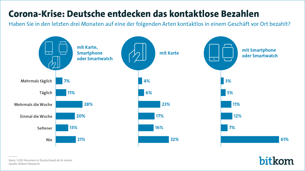 „Noch vor kurzem war es ein exotischer Anblick, wenn jemand an der Kasse sein Smartphone gezückt hat oder seine Smartwatch an das Kartenlesegerät hielt“, sagt Bitkom-Hauptgeschäftsführer Bernhard Rohleder. „Das Smartphone ist für die meisten Menschen ständiger Begleiter und eignet sich daher ideal auch als Ersatz für die Brieftasche.“ Gerade bei der täglichen Nutzung liegt die kontaktlose Kartenzahlung inzwischen nur noch knapp vor Smartphone und Smartwatch.