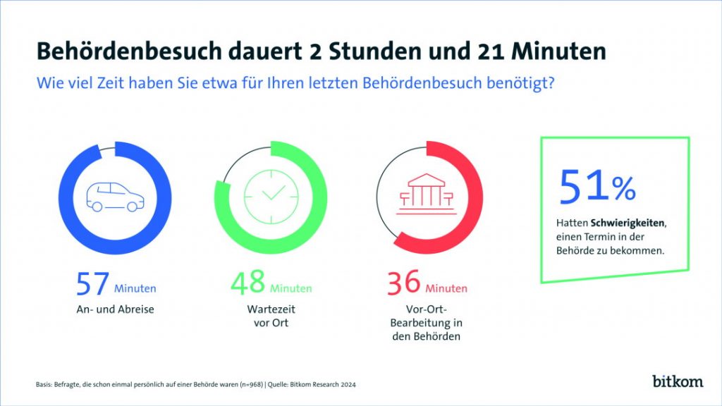 Personalausweis verlängern, Kindergeldantrag stellen oder sich nach dem Umzug ummelden: Für die meisten Bundesbürger sind Behördengänge echte Zeitfresser. Im Durchschnitt dauert der Besuch auf dem Amt 2 Stunden und 21 Minuten. Dabei entfallen 57 Minuten auf die An- und Abreise, 48 Minuten auf die Wartezeit vor Ort. Die Bearbeitung des Anliegens selbst benötigt 36 Minuten. Das sind Ergebnisse einer Befragung des Digitalverbands Bitkom. „Das Ziel muss sein, künftig alle Behördenkontakte digital abzuwickeln. Die Menschen in Deutschland würden dadurch viel Zeit sparen. Vor allem aber würde der Aufwand in den Behörden durch einen vollständig digitalen Antrags- und Bearbeitungsprozess drastisch reduziert“, sagt Bitkom-Präsident Ralf Wintergerst.