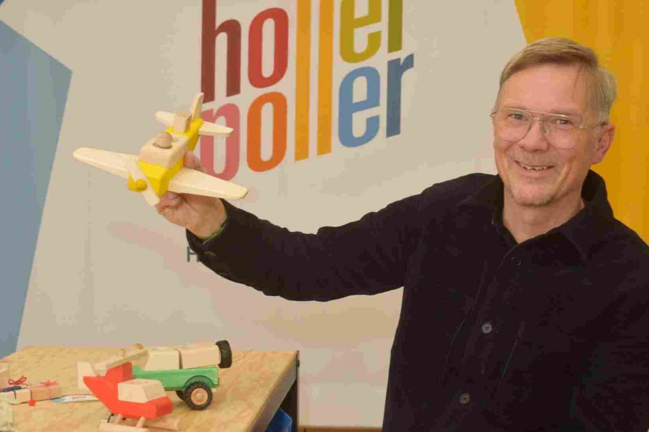 Das jüngste Unternehmen in der Spielwarenregion Nürnberg ist Holler Poller aus Schwaig. Peter Jaensch machte sich im letzten Jahr mit seinem selbst konstruierten Holzspielzeug selbstständig. Der studierte Produktdesigner entschied sich für eine eigne Firma aus dem Leid am bestehenden Spielzeug-Design. Als gelernter Modellbauer hatte er schon während seiner Ausbildung bei Porsche viel mit Holz zu tun. Dieses Know-how hilft ihm jetzt, in seiner Kellerwerkstatt Holzspielzeug für Kleinkinder zu designen, das die „spielende Fantasie“ der Zwei- und Dreijährigen beflügelt. „Vieles vom gängigen Spielzeugmarkt ist pädagogisch schrecklich“, findet der Familienvater.