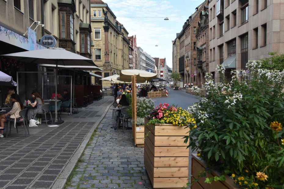 Röder hatte gemeinsam mit dem Nürnberger Wirtschaftsreferat im letzten Sommer die Adlerstraße in der City in eine Summer Street verwandelt. Es galt Tempo zehn, ein mobiler Baum verengte die Straße und bremste den Autoverkehr baulich aus. Ab dort wurden die Parkplätze in der Sackgasse mit einem Parkhaus am Ende vorrübergehend von erweiterten Gastro-Außenbereichen, freien Sitzmöglichkeiten und hohen Blumenkästen in Beschlag genommen. Das Ziel ist für Röder klar: „Wir müssen die Menschen wieder zurück in die Stadt bekommen.“